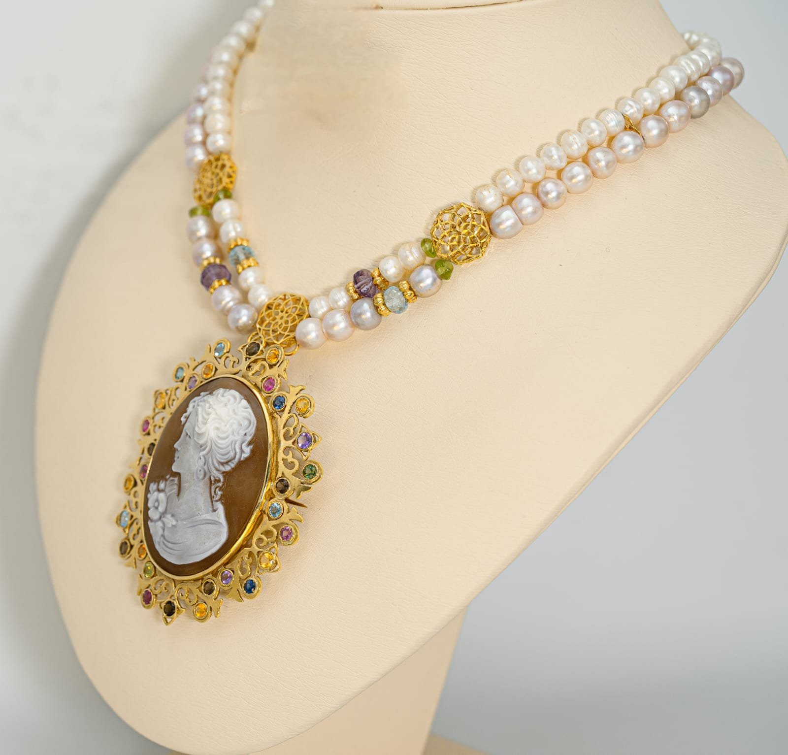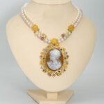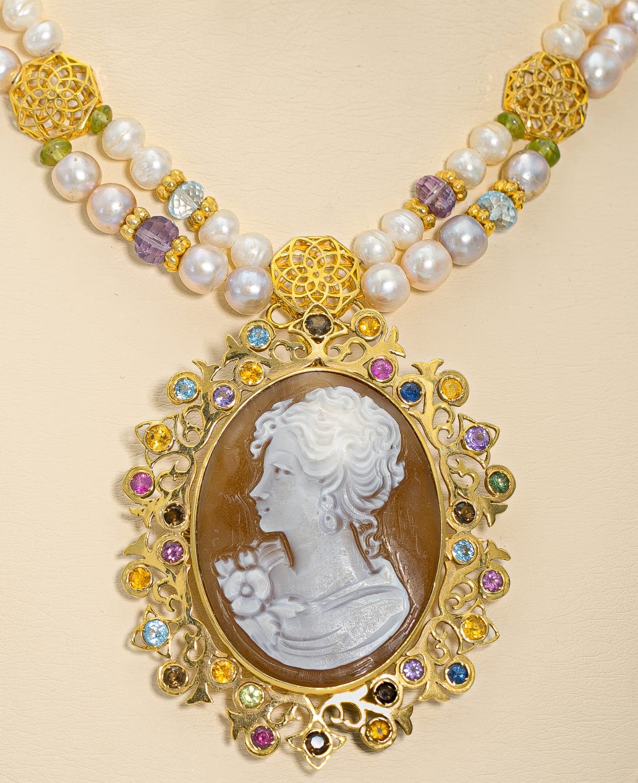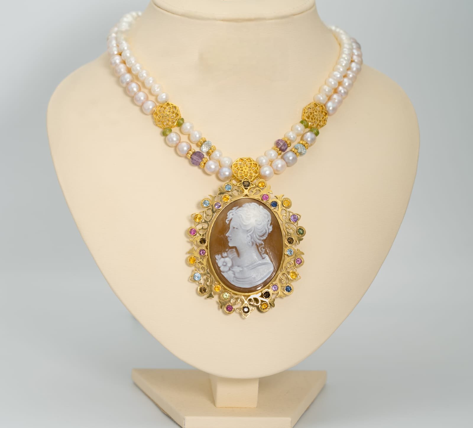 A necklace of gold (18K) with pearls and precious stones with the famous Cameo carving and decoration (carving from the city of Naples _ Italy on a special shell mixed with coral) that hangs from the center and is surrounded by a luxurious frame that combines modernity and legend studded with colored sapphires, topaz and amethyst