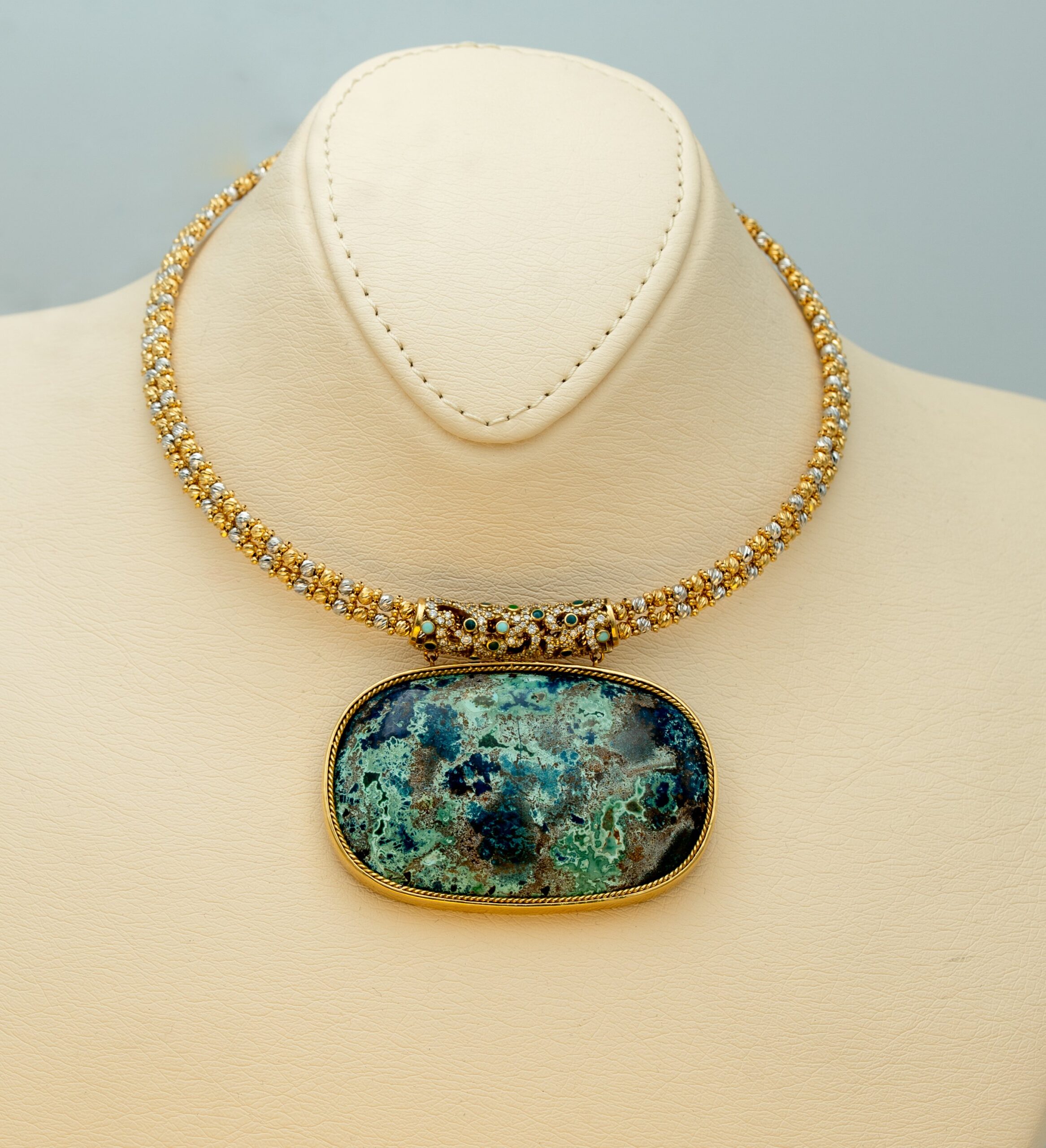 The legend of high art is a necklace in the form of a collar in gold (18K) with a design of diamonds and enamel, which matches the colors of the unique chrysocolla stone (a semi-precious stone famous for its blue and green colors that resemble the colors of (tropical seas).