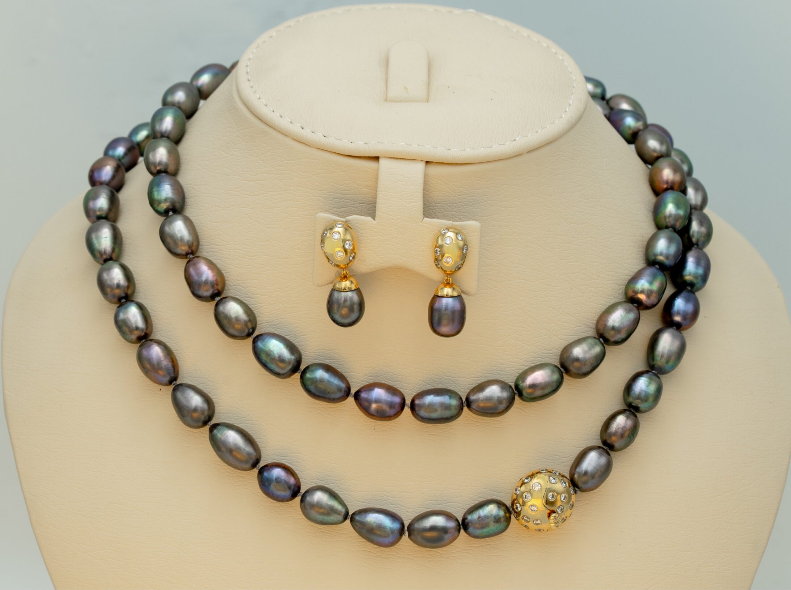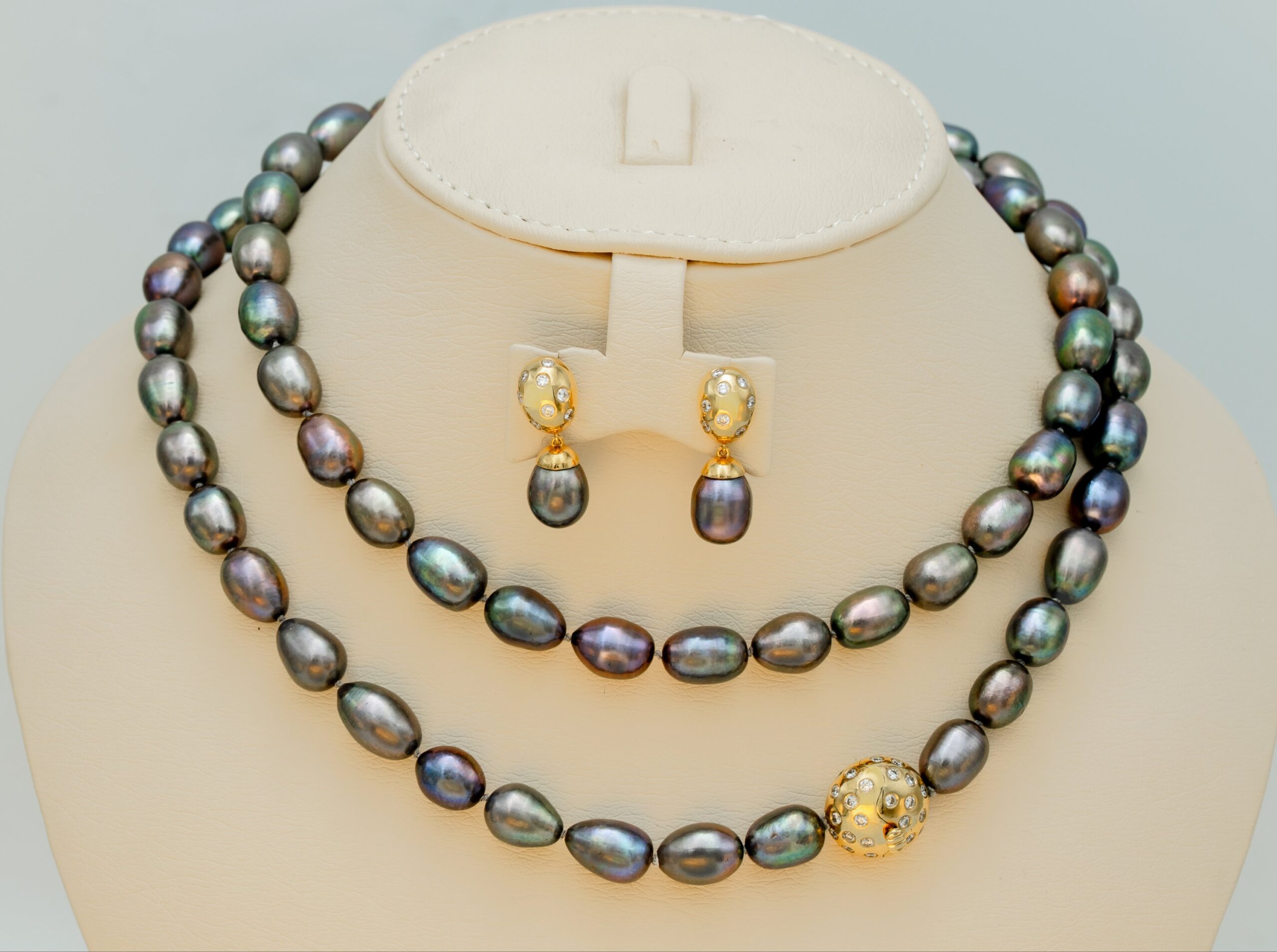 Necklace (ranging in color from dark gray to black with a slight iridescent sheen) with matching earrings, both set in gold (18K) and diamonds